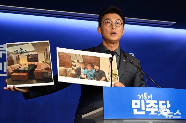 노종면 더불어민주당 선거대책위원회 대변인이 19일 오후 서울 여의도 중앙당사에서 '지귀연 판사 룸살롱 접대 의혹' 관련 사진을 공개하고 있다.