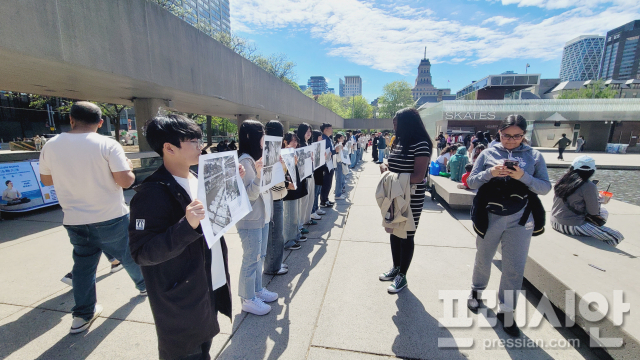 ▲'책으로 세계'로 프로그램에 참여한 광주 학생 20여명이 캐나다 토론토 중심가 네이선필립스광장에서 5·18민주화 운동 당시의 사진과 설명이 담긴 용지를 들고 있다.ⓒ광주시교육청 |