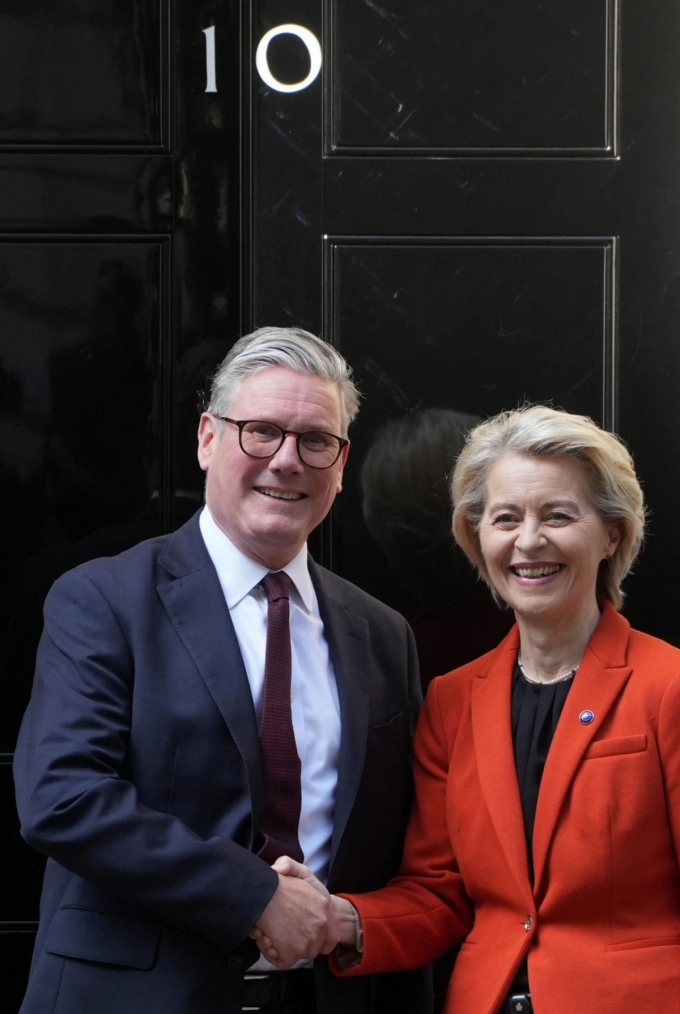 키어 스타머 영국 총리와 우르줄라 폰데어라이엔 EU 집행위원장이 24일(현지시간) 런던 다우닝가 10번지 앞에서 악수를 하고 있다. 2025.04.25 /AFPBBNews=뉴스1 |