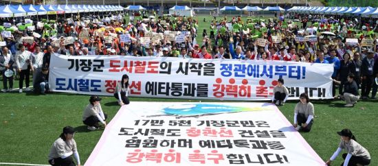 부산 기장군이 ‘도시철도 정관선 예타 통과’ 범군민 총궐기대회를 개최하고 있다. 기장군 제공 |