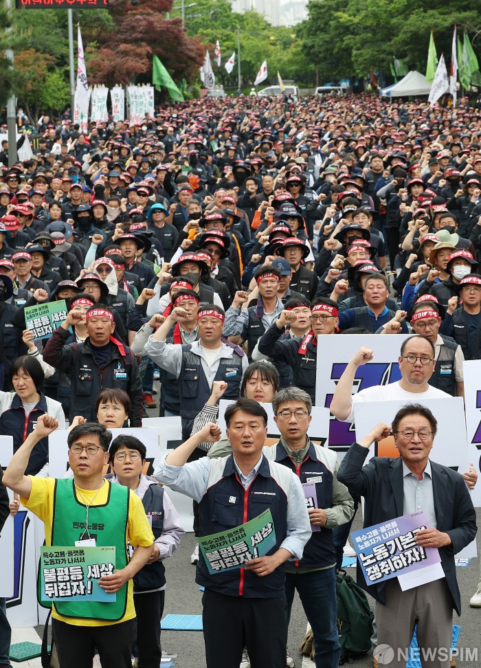 [서울=뉴스핌] 정일구 기자 = 19일 오후 서울 여의도 국회 인근에서 열린 '특수고용·플랫폼 노동자 노동기본권 쟁취' 민주노총 결의대회에서 참가자들이 구호를 외치고 있다. 2025.05.19 mironj19@newspim.com