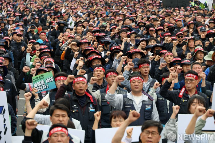 [서울=뉴스핌] 정일구 기자 = 19일 오후 서울 여의도 국회 인근에서 열린 '특수고용·플랫폼 노동자 노동기본권 쟁취' 민주노총 결의대회에서 참가자들이 구호를 외치고 있다. 2025.05.19 mironj19@newspim.com