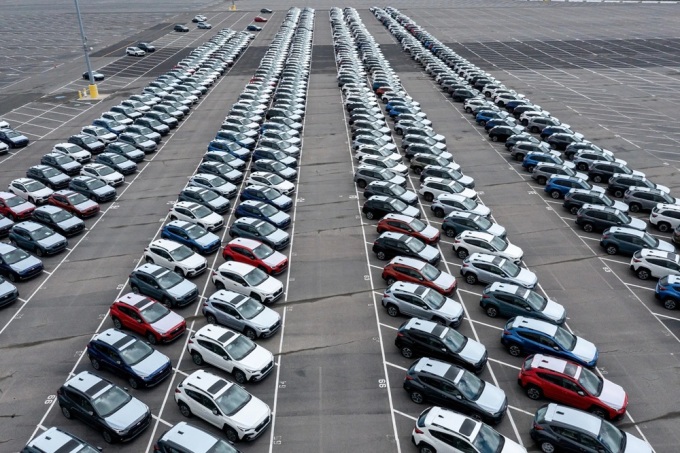 미국 캘리포니아 항만에 줄지어 선 자동차. [사진=블룸버그] |