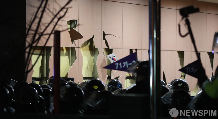 지난 1월 9일 새벽 서울 마포구 서울서부지방법원 청사 벽면이 파손되어 있다. 이날 윤석열 대통령 구속영장이 발부되자 윤 대통령 지지자들이 서울서부지법에 난입해 유리창을 깨고 집기를 훼손하는 등 난동을 부려 경찰이 강제진압에 나갔다. [사진=뉴스핌 DB] |