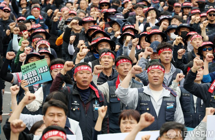 [서울=뉴스핌] 정일구 기자 = 19일 오후 서울 여의도 국회 인근에서 열린 '특수고용·플랫폼 노동자 노동기본권 쟁취' 민주노총 결의대회에서 참가자들이 구호를 외치고 있다. 2025.05.19 mironj19@newspim.com