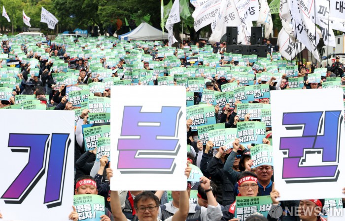 [서울=뉴스핌] 정일구 기자 = 19일 오후 서울 여의도 국회 인근에서 열린 '특수고용·플랫폼 노동자 노동기본권 쟁취' 민주노총 결의대회에서 참가자들이 손팻말을 들고 구호를 외치고 있다. 2025.05.19 mironj19@newspim.com