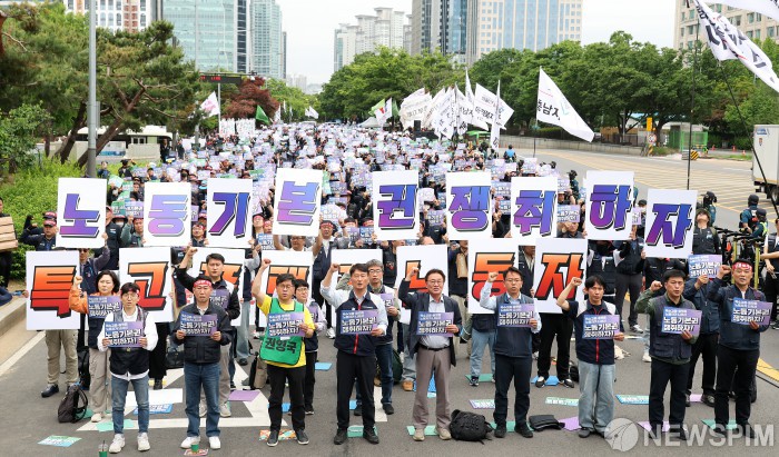 [서울=뉴스핌] 정일구 기자 = 19일 오후 서울 여의도 국회 인근에서 열린 '특수고용·플랫폼 노동자 노동기본권 쟁취' 민주노총 결의대회에서 참가자들이 손팻말을 들고 구호를 외치고 있다. 2025.05.19 mironj19@newspim.com