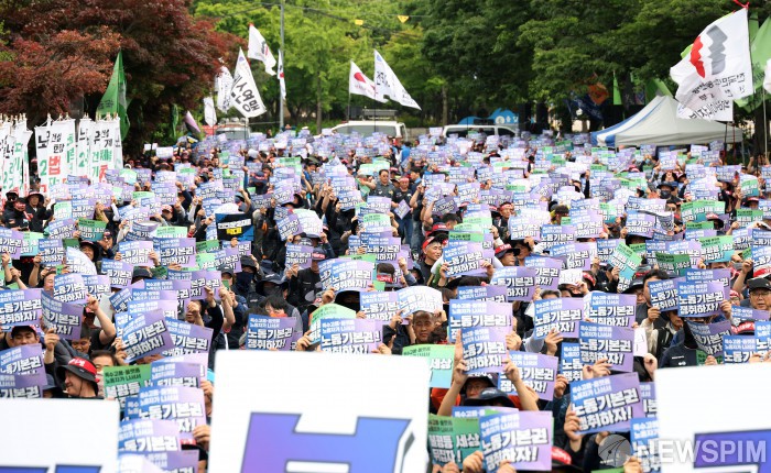 [서울=뉴스핌] 정일구 기자 = 19일 오후 서울 여의도 국회 인근에서 열린 '특수고용·플랫폼 노동자 노동기본권 쟁취' 민주노총 결의대회에서 참가자들이 손팻말을 들고 구호를 외치고 있다. 2025.05.19 mironj19@newspim.com