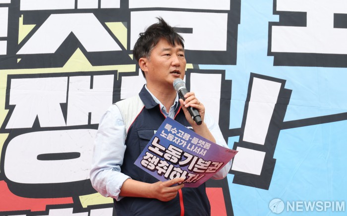 [서울=뉴스핌] 정일구 기자 = 양경수 민주노총 위원장이 19일 오후 서울 여의도 국회 인근에서 열린 '특수고용·플랫폼 노동자 노동기본권 쟁취' 민주노총 결의대회에서 발언하고 있다. 2025.05.19 mironj19@newspim.com