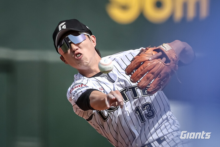 롯데 자이언츠 전민재가 18일 부산 사직 야구장에서 열린 2025시즌 프로야구 KBO리그 삼성 라이온즈와 경기에서 수비하고 있다. 롯데 자이언츠 제공