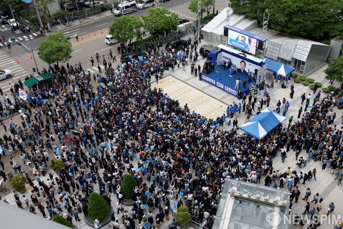 [서울=뉴스핌] 윤창빈 기자 = 이재명 더불어민주당 대선후보가 19일 오후 서울 영등포구 타임스퀘어 앞에서 열린 유세에서 지지를 호소하고 있다. 2025.05.19 pangbin@newspim.com |