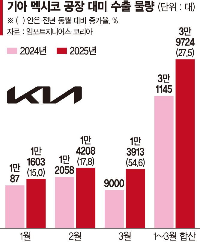 같은 기간 기아의 한국발 미국 수출물량 증가율이 2.3%인 점과 비교하면 멕시코 공장의 대미 수출 증가율은 12배가량 더 높았다. 한국자동차모빌리티산업협회(KAMA)에 따르면 올해 1·4분기 기아는 한국에서 9만9834대의 차량을 미국에 보냈다. 지난해 1·4분기 수출물량은 9만7590대다.