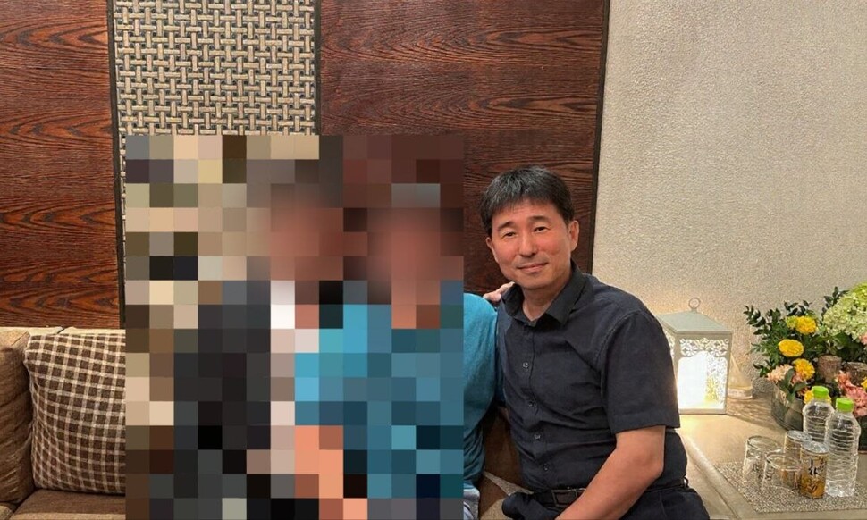 더불어민주당이 지귀연 부장판사 향응 접대 의혹을 제기하며 19일 공개한 사진. 지 부장판사(가장 오른쪽)가 동석자 두 명과 앉아있다. 민주당 제공