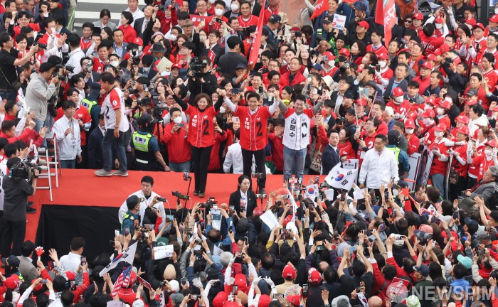 [서울=뉴스핌] 최지환 기자 = 김문수 국민의힘 대선 후보와 나경원, 안철수 공동선거대책위원장이 19일 오후 서울 중구 서울역 광장에서 진행된 “쏘울을 새롭게” 서울역 광장 유세에서 지지를 호소하고 있다. 2025.5.19 choipix16@newspim.com |