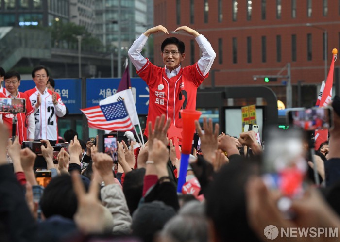 [서울=뉴스핌] 최지환 기자 = 국민의힘 김문수 대선후보가 19일 오후 서울역광장에서 유세를 갖고 지지자들을 향해 하트를 그리고 있다. 2025.05.19 choipix16@newspim.com