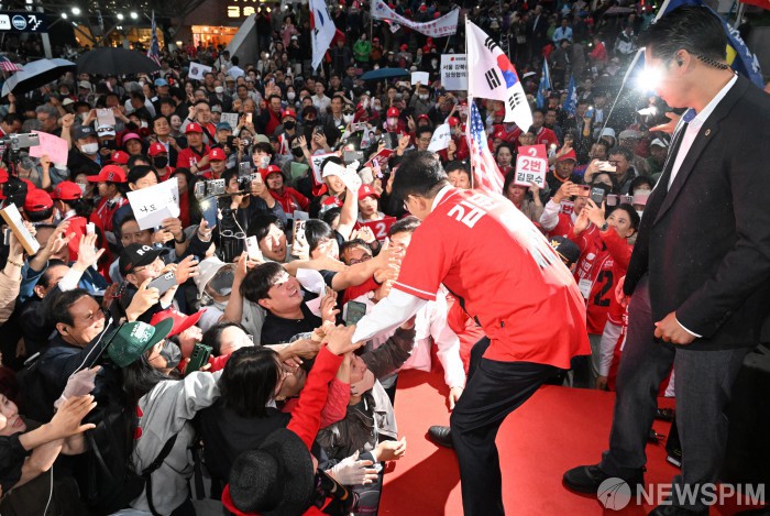 [서울=뉴스핌] 최지환 기자 = 김문수 국민의힘 대선후보가 19일 서울역 광장 유세를 마치고 지지자와 악수하고 있다. 2025.05.19 choipix16@newspim.com