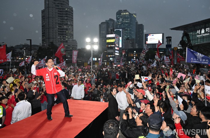[서울=뉴스핌] 최지환 기자 = 김문수 국민의힘 대선후보가 19일 서울역 광장 유세에서 연설을 하고 있다. 2025.05.19 choipix16@newspim.com
