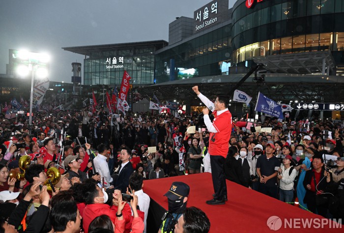 [서울=뉴스핌] 최지환 기자 = 김문수 국민의힘 대선후보가 19일 서울역 광장 유세에서 연설을 하고 있다. 2025.05.19 choipix16@newspim.com