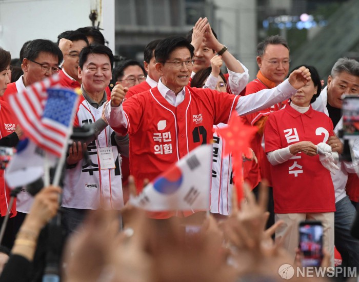 [서울=뉴스핌] 최지환 기자 = 국민의힘 김문수 대선후보가 19일 오후 서울역광장에서 유세를 갖고 지지자들을 향해 주먹을 쥐어보이고 있다. 2025.05.19 choipix16@newspim.com |
