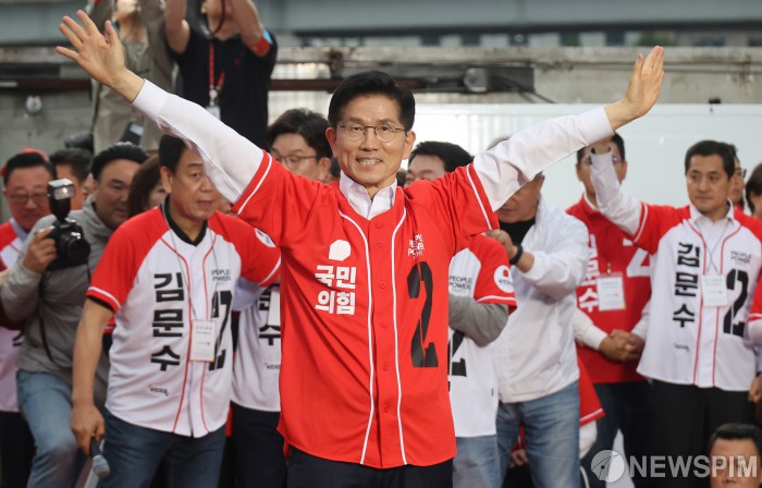 [서울=뉴스핌] 최지환 기자 = 김문수 국민의힘 대선 후보가 19일 오후 서울 중구 서울역 광장에서 열린 ‘쏘울을 새롭게’ 유세에서 유권자들에게 지지를 호소하고 있다. 2025.5.19 choipix16@newspim.com