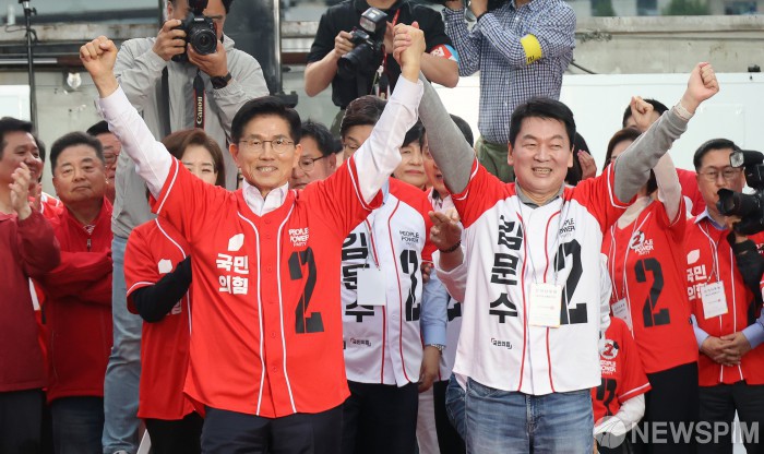 [서울=뉴스핌] 최지환 기자 = 김문수 국민의힘 대선 후보가 19일 오후 서울 중구 서울역 광장에서 열린 ‘쏘울을 새롭게’ 유세에서 안철수 공동선대위원장과 함께 유권자들에게 손을 들어보이며 인사하고 있다. 2025.5.19 choipix16@newspim.com |
