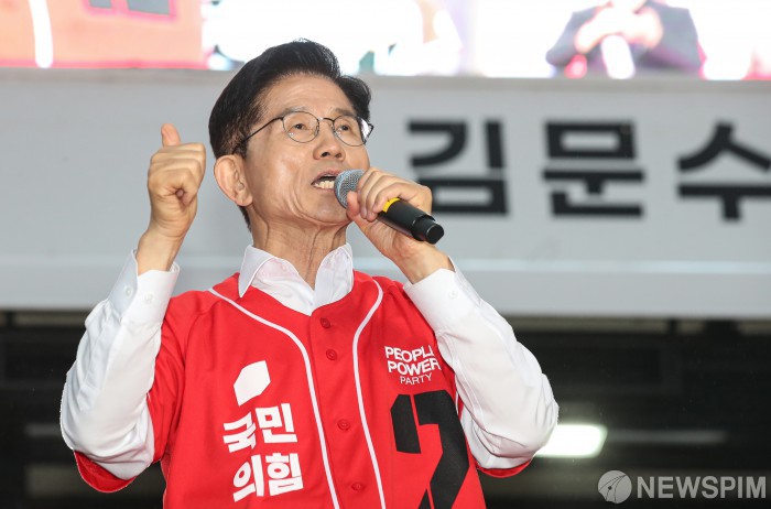 [서울=뉴스핌] 최지환 기자 = 김문수 국민의힘 대선후보가 19일 오후 서울 용산구 서울역 광장에서 열린 유세에서 지지를 호소하고 있다. 2025.05.19 choipix16@newspim.com