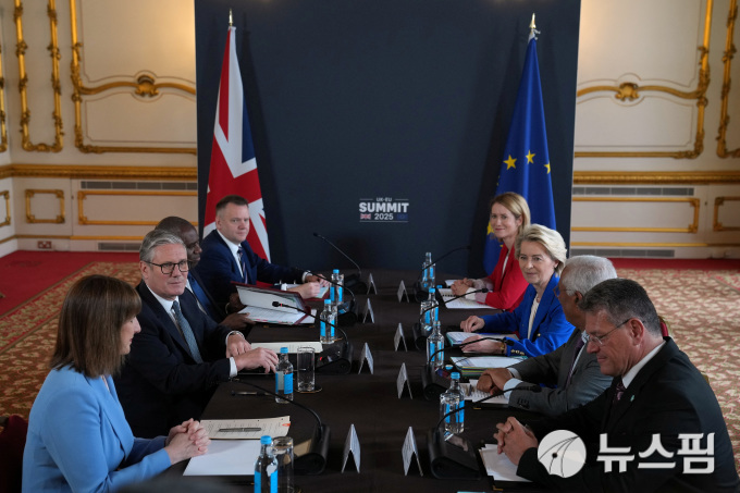 [런던 로이터=뉴스핌] 장일현 특파원 = 유럽연합(EU)과 영국의 정상이 19일(현지시간) 영국 런던 랭카스터 하우스에서 정상회담을 개최하고 있다. 양측의 정상회담은 지난 2020년 1월 영국의 유럽연합 탈퇴 이후 처음이다. 왼쪽 아래에서 두 번째가 키어 스타머 영국 총리, 오른쪽 위에서 두 번째가 우르줄라 폰데어라이엔 EU 집행위원장. 2025.05.19. ihjang67@newspim.com |