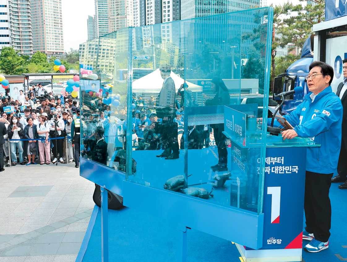 이재명 방탄유리 연설, 김문수 서울역 광장 유세 6·3 대선 공식 선거운동 2주차를 맞는 19일 더불어민주당 이재명 후보와 국민의힘 김문수 후보가 일제히 서울에서 유세를 펼쳤다. 위쪽 사진은 이 후보가 서울 용산역 광장에서 3면으로 둘러싸인 방탄유리 뒤에서 연설을 하는 모습. 아래쪽 사진은 이날 저녁 서울역 광장에서 유세를 하고 있는 김 후보다. 뉴스1·장승윤 기자 tomato99@donga.com |