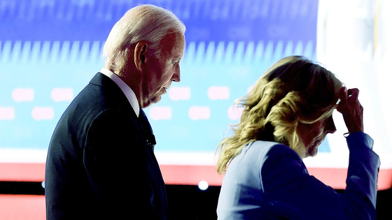 지난해 6월 27일 조 바이든 전 대통령이 조지아주 애틀랜타 CNN 스튜디오에서 진행된 대선 토론을 마친 뒤 질 바이든 여사의 손을 잡고 스튜디오를 빠져나가고 있다. 당시 바이든 전 대통령은 토론 내내 인지력에 문제가 있는게 아니냐는 지적을 받았고, 결국 대선 후보직에서 사퇴했다. AFP=연합뉴스 |