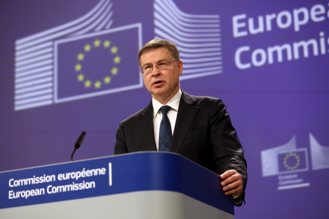 발디스 돔브로우스키스 유럽연합(EU) 경제담당 집행위원이 19일(현지시간) 벨기에 브뤼셀에서 2025년 봄 경제 전망 발표 기자회견을 하고 있다. 브뤼셀/EPA연합뉴스 |
