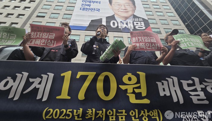 [서울=뉴스핌] 김학선 기자 = 민주노총 공공운수노조 조합원들이 20일 서울 여의도 이재명 더불어민주당 대선후보 캠프 앞에서 "대선후보에게 170원을 배달합니다" 최저임금 인상 촉구 기자회견을 열고 있다. 지난해 최저임금위원회는 2025년 최저임금을 기존 대비 170원 인상하는 10,030원으로 결정, 이는 작년대비 1.7% 인상으로 1988년 제도 시행이래 역대 두 번째로 낮은 인상률을 보였다. 2025.05.20 yooksa@newspim.com