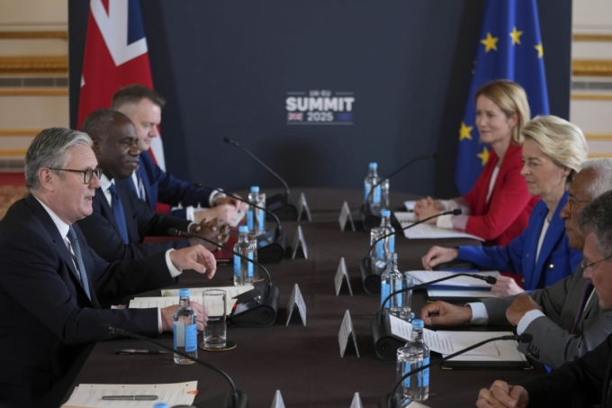 키어 스타머 영국 총리(왼쪽)가 19일 런던에서 우르줄라 폰 데어 라이엔 유럽연합(EU) 집행위원장(오른쪽 3번째)과 회담하고 있다. /AP=뉴시스 |