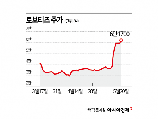 21일 금융투자업계에 따르면 로보티즈 주가는 지난 3월 18일부터 두달 동안 52.3% 올랐다. 같은 기간 코스닥 지수는 3.8% 하락했다.