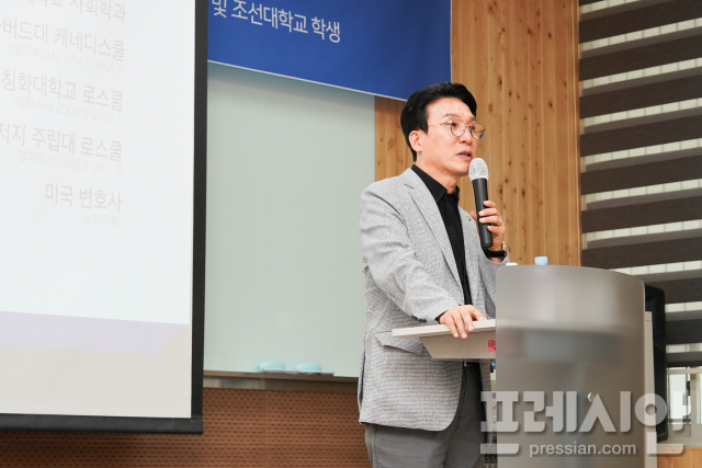 ▲김민석 더불어민주당 수석최고위원이 20일 조선대 법과대학에서 특강을 진행하고 있다.ⓒ조선대 |