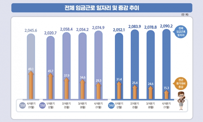 통계청이 21일 발표한 '2024년 4분기 임금근로 일자리동향'에 따르면 지난해 4분기 전체 임금근로 일자리는 전년 동기보다 15만3000개 증가한 2090만2000개로 집계됐다. 일자리 증가폭은 전년 동기(29만3000개)에 비해 절반 수준으로 줄었다.