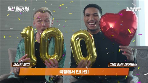 '미션 임파서블 8'에 출연한 배우 사이먼 페그와 그레그 타잔 데이비스는 한국 팬들에게 보내는 영상에서 "보내주신 사랑에 감사드린다. 올 5월 단 하나의 선택은 '미션 임파서블 8'이다. 극장에서 만나자"고 말했다.