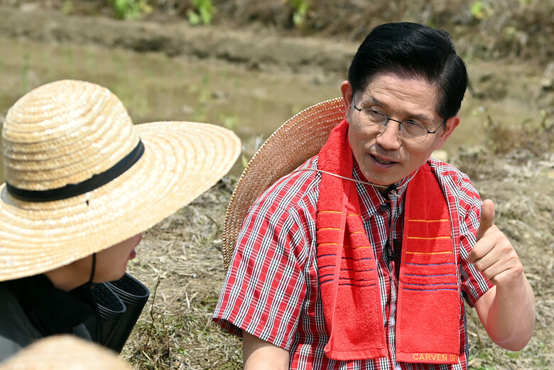 김문수 국민의힘 대통령 후보가 21일 오후 경기 고양시 덕양구 화정동 일대 논에서 청년농업인들과 새참간담회를 하고 있다. 공동취재사진 |