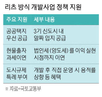 우선 3기 신도시 내 우량 용지 일부를 공모 방식(수의계약)으로 공급할 방침이다. 국토부 관계자는 "역세권에 있는 업무·상업용지를 프로젝트 리츠로 개발·운영할 수 있게 하겠다"며 "복합개발을 통해 주택을 일부 포함시키는 방안도 긍정적으로 검토 중"이라고 밝혔다. 주택 분양수익과 업무·상업용지 운영수익이 적절히 나도록 설계하겠다는 의미다.