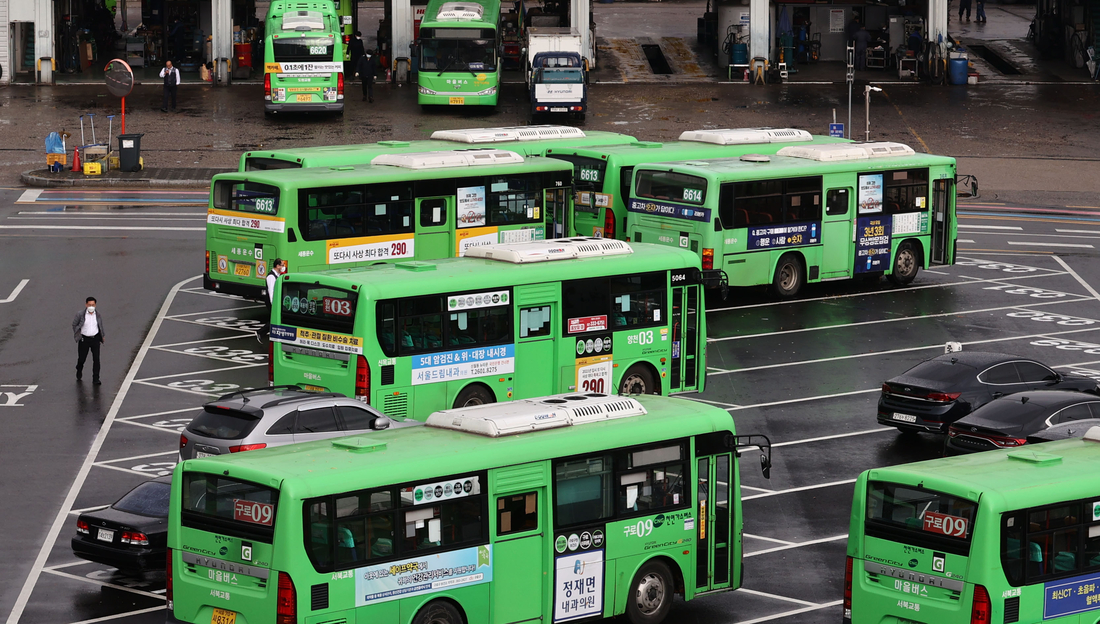 서울의 한 버스 공영차고지에 시내버스와 마을버스들이 주차돼 있다. 연합뉴스 |