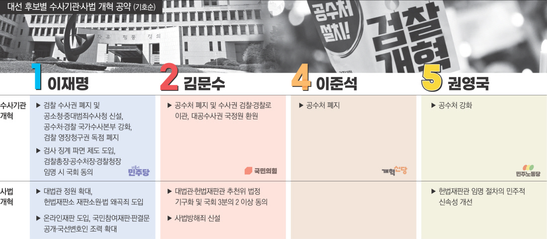 6·3 대선에 나선 후보들은 문재인 정부 시기 진행된 검찰 수사권 축소와 고위공직자범죄수사처 설치에 대한 평가를 바탕으로 저마다 수사기관 개혁 공약을 내놨다. 이재명 더불어민주당 후보는 수사·기소권의 완전한 분리와 기소권 남용에 대한 사법통제 강화를 내걸었다. 김문수 국민의힘 후보는 공수처를 폐지하고 공수처 수사권을 검찰·경찰로 되돌리겠다고 했다. 이준석 개혁신당 후보는 공수처 폐지를, 권영국 민주노동당 후보는 공수처 강화를 약속했다. 주요 후보들이 공수처 등과 관련해 정반대 공약을 내놓으면서 공수처는 새 정부에서 제 기능을 하는 조직으로 자리 잡을지 사라질지 기로에 서게 될 것으로 보인다.