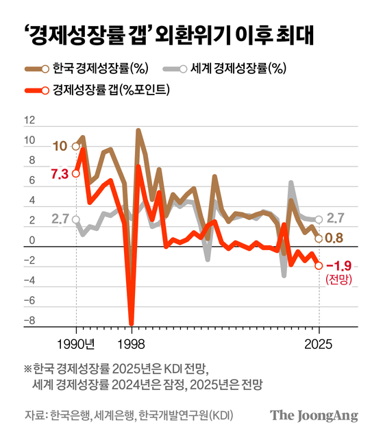 그동안 한국 경제는 세계 경제보다 더 많이 성장하거나 이에 미치지 못 하더라도 0%포인트대 차이를 보였다. 한국의 경제성장률이 세계 성장률을 본격적으로 밑돈 건 2021년부터다. 2021년(1.8%포인트), 2022년(0.5%포인트), 2023년(1.4%포인트), 2024년(0.7%포인트)을 넘어 올해는 외환위기 이후 최대로 벌어질 전망이다. 2021년 성장률 격차(1.8%포인트)와 비슷한 수준이라고는 하지만, 이땐 2020년 코로나19 때 상대적으로 성장률이 덜 떨어졌던 기저효과가 컸다.