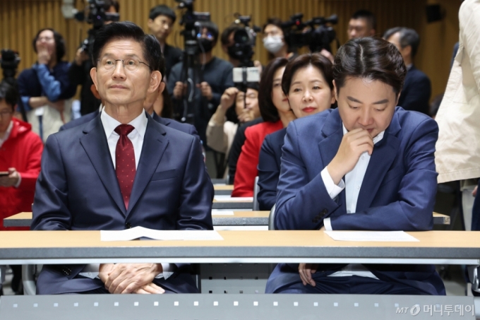 (서울=뉴스1) 민경석 기자 = 김문수 국민의힘 대통령 후보(왼쪽)와 이준석 개혁신당 대통령 후보가 19일 오전 서울 중구 서울시청에서 열린 '약자와 동행하는 서울 토론회'에 참석해 나란히 앉아 있다. 2025.5.19/뉴스1 Copyright (C) 뉴스1. All rights reserved. 무단 전재 및 재배포, AI학습 이용 금지. /사진=(서울=뉴스1) 민경석 기자 |