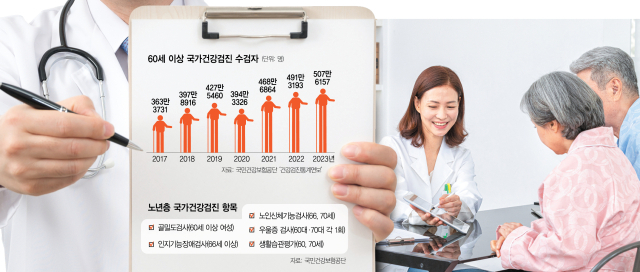 21일 국민건강보험공단에 따르면 2년마다 한 번씩 진행하는 국가건강검진을 본인부담금 없이 받을 수 있다. 이 검진을 받는 사람들이 꾸준히 늘어 60세 이상의 경우 2023년 기준 500만 명을 넘어섰다. 신현영 서울성모병원 가정의학과 교수는 “건강검진은 질병 예방과 조기 발견을 위해 매우 중요하다"며 “담당의사와 평생 건강검진 주기와 항목을 상의해 개인 맞춤형으로 진행하는 것이 효과적”이라고 권했다. 이은주 서울아산병원 노년내과 교수는 “증상이 없다고 해도 새로운 질병이 생기기도 하고, 병이 생겼으면 빨리 치료를 받아야 예후가 좋다”며 “어르신들에게 ‘건강수명이 5년 이상 될 것 같으면 내시경을 하시라’고 이야기하며 검진을 권한다”고 전했다.