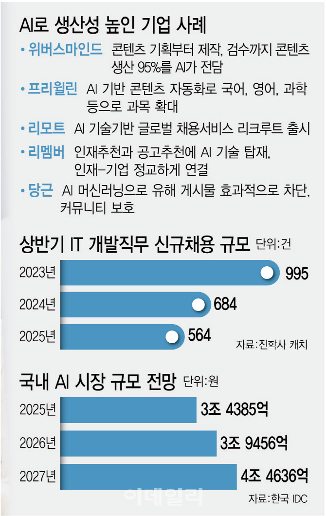 진학사 캐치에 따르면 개발자와 데이터 처리 등 자동화 가능성이 높은 직군의 채용 수요는 경력사원(상반기 기준)의 경우 2023년 8609건에서 올해 5193건으로 줄었고, 신입사원도 같은 기간 995건에서 564건으로 감소했다. 올해 개발자 직군의 채용공고는 2년 전 대비 40% 줄어든 것이다.