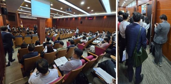 국토교통부가 21일 서울 영등포구 금융투자협회에서 개최한 '부동산 산업 선진화를 위한 리츠 및 PF 정책 설명회'에 참석한 리츠·주택·건설·부동산개발 업계 관계자들. 행사장 내부는 물론 복도에서 서서 설명을 들을 정도로 현장은 북새통을 이뤘다. 최서윤 기자 |