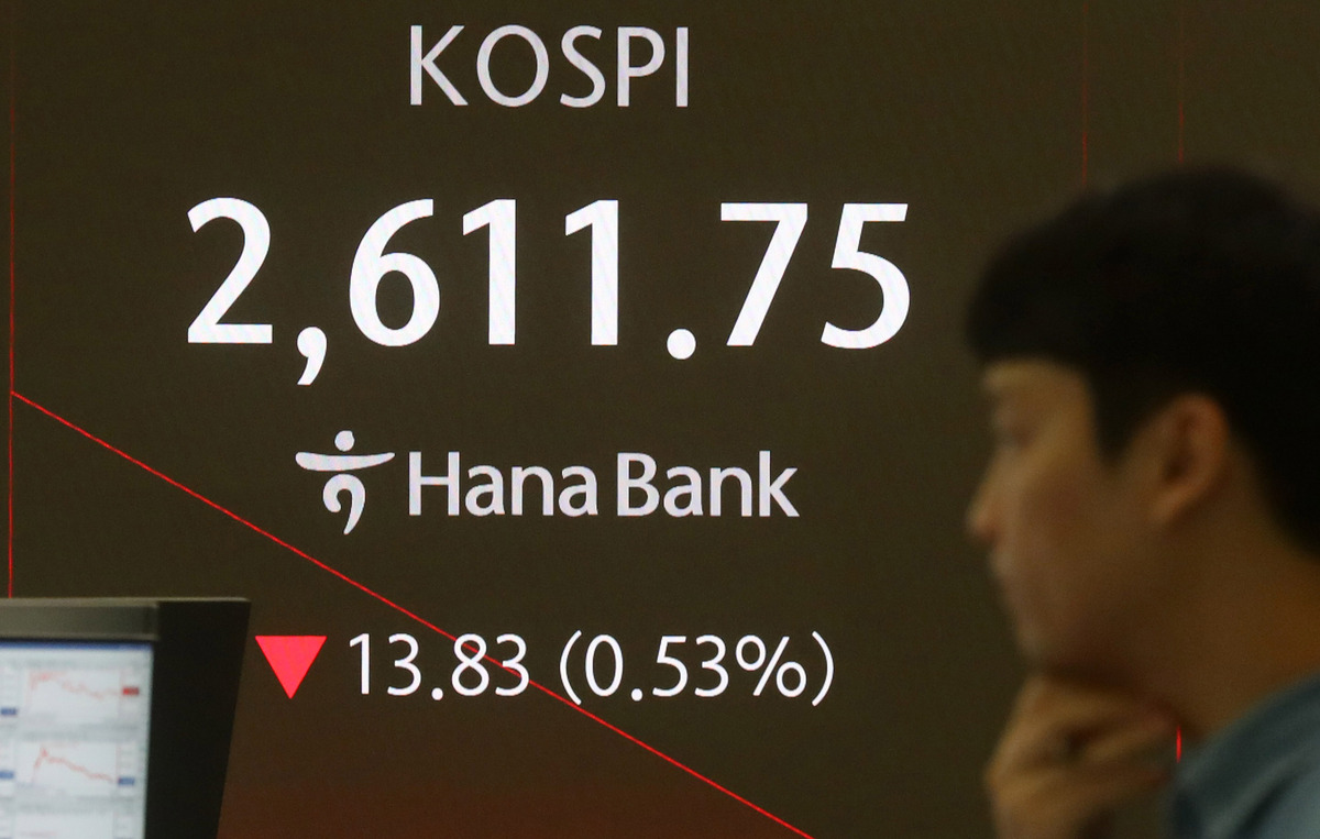 코스피가 전 거래일(2625.58)보다 10.92포인트(0.42%) 하락한 2614.66에 개장한 22일 오전 서울 중구 하나은행 딜링룸 전광판에 지수가 표시 되고 있다. 뉴시스 |