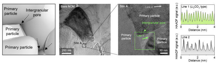 고해상도 전자현미경, 질소 흡착 분석, 전자 에너지 손실 분광 등 첨단 분석법으로 양극재를 정밀 분석해 잔류 리튬 화합물이 입자 간 미세한 틈에 결정질 형태로 존재하며 주된 성능 저하 원인이 됨을 확인했다.