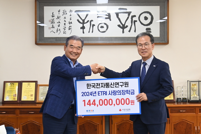 방승찬 ETRI 원장(오른쪽)이 유재욱 대전사회복지공동모금회장에게 2024년도 ETRI 사랑의 장학금 및 장학증서를 전달하고 있다. |