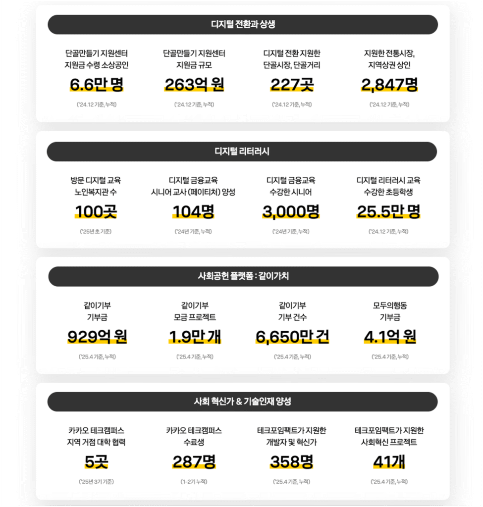 눈에 띄는 또 다른 특징은 지역 기반의 인재 양성과 문제 해결 접근이다. ‘카카오 테크캠퍼스’는 전국 5개 지역 거점 대학과 협력해 실무형 IT 교육을 운영하고 있으며, 287명의 수료생을 배출했다. 동시에 ‘인터넷하는 돌하르방’, ‘제주 임팩트 챌린지’ 등 제주를 중심으로 한 지역밀착형 공익 프로젝트도 병행되었다. 이러한 활동은 전국적 범위의 사회공헌 전략 속에서 지역성을 존중하는 사례로 기능한다.