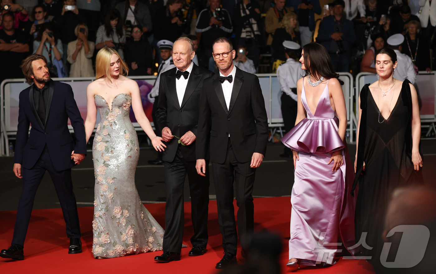 (파리=뉴스1) 이준성 기자 = 21일(현지시간) 프랑스 남부 소도시 칸(Cannes) 팔레 데 페스티발(Palais des Festival) 뤼미에르 대극장에서 열린 ‘제78회 칸 국제영화제’ 경쟁부문 진출작 영화 ‘센티멘털 밸류(감독 요아킴 트리에르)’ 월드 프리미어 시사회에 출연 배우 앤더스 다니엘슨 리(왼쪽부터)와 엘 패닝, 스텔란 스카스가드, 요아킴 트리에르 감독, 배우 레나테 레인스베, 안드레아 베렌첸 오트마르가 레드 카펫에 오르고 있다. 2025.5.22/뉴스1